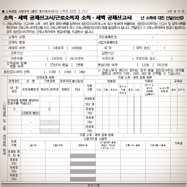 ▶ 연말정산의 계절이 돌아왔습니다. 요즘에는 연말정산 간소화시스템으로 간편하게 신고할 수 있는데요. 사정상 수기 신고를 하게 되는 경우도 있어 국세청 서식을 올려봅니다. 2020. 3. 13.자 개정된 사항이 반영된 서식이므로, 작성 시점에 따라 공제비율 및 양식이 다를 수 있다는 점을 유념하시기 바랍니다.