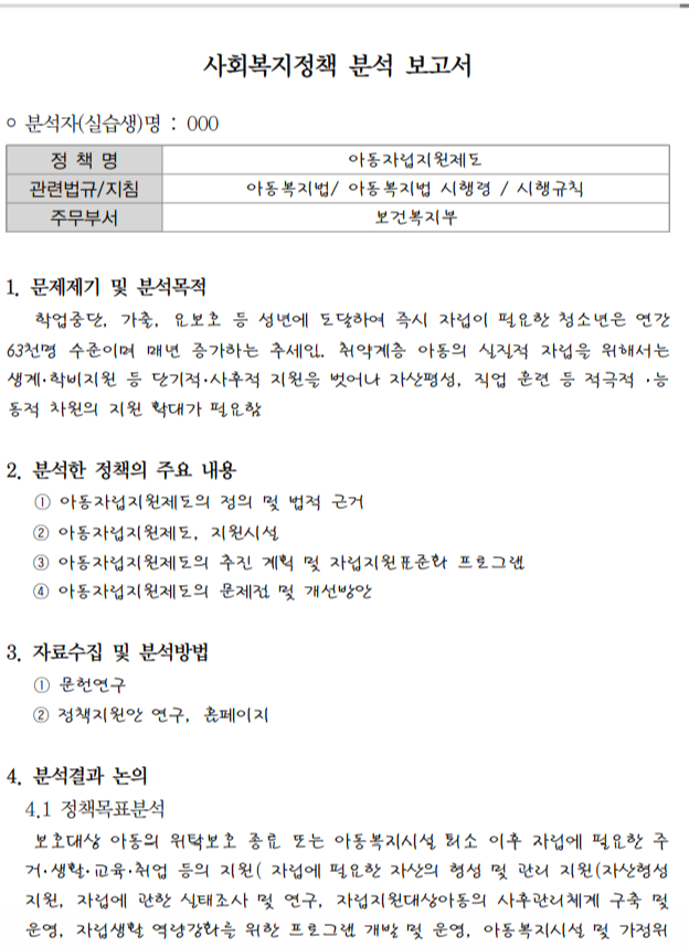 사회복지 정책 분석 보고서 작성 예시/양식 다운로드