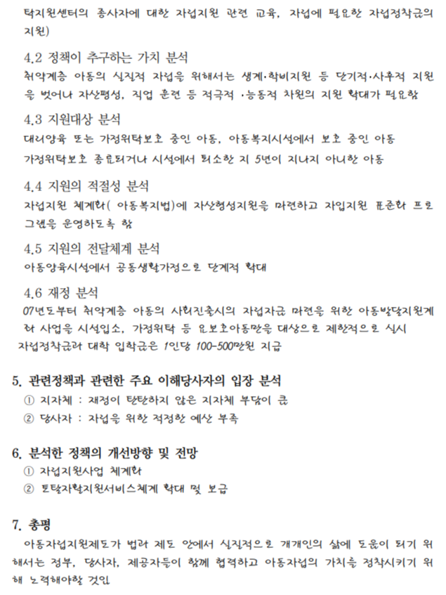 사회복지 정책 분석 보고서 작성 예시 아동 자립지원 제도