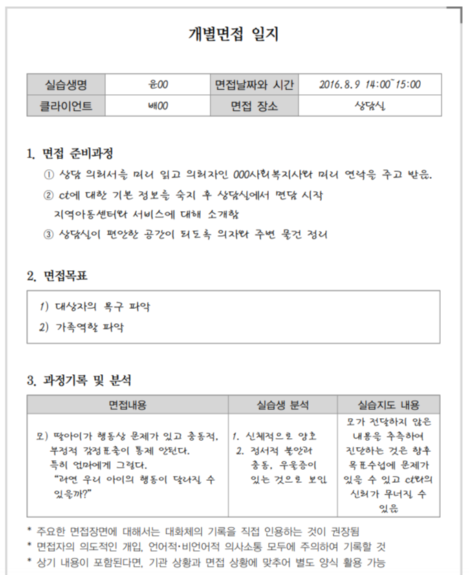 과정기록 및 분석은 면담과정에서 있었던 면접 내용을 대화체 또는 요약체로 기재합니다. 상황에 따라서는 클라이언트의 동의를 받아 녹음하여 녹음된 내용을 바탕으로 기재해도 괜찮습니다. 면접 내용은 향후 클라이언트에 대한 중요한 자료가 되므로 클라이언트의 특성에 대해 보다 잘 파악할 수 있도록 대화체로 기재하는 것이 바람직합니다. 실습생은 객관적인 자세를 유지하며 어떠한 판단이나 부정적인 말을 하지 않도록 유의하여야 합니다. 실습생은 면접자로서 의도적으로 개입하건, 언어적 비언어적인 표현에 주의합니다. 면접자로서 실습생은 면접 내용에 대해 클라이언트에게 직접 표현하지 말고 해당 개별면접 일지에 실습생 분석 사항을 기재합니다. 실습생 분석 사항은 개별면접 일지로는 전달될 수 없는 부분들 가령, 반복되는 행동이나 안색 등을 통하여 유추할 수 있는 사항들을 기재합니다. 실습지도 내용은 실습지도자가 기재하는 것이므로 공란으로 남겨둡니다.