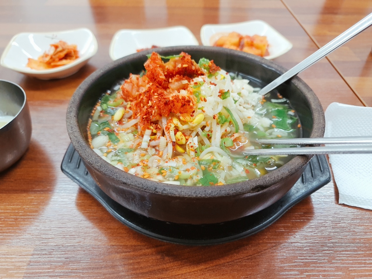 메뉴를 봐서는 뭐가뭔지 잘 모르겠지만, 보통의 콩나물 국밥은 팔팔콩나물 국밥인 것 같아서 팔팔콩나물 국밥을 주문했어요. 간만에 먹는 수란도 얼마나 맛있던지요. 국물도 뜨끈하고 맛있었습니다. 가끔 뚝배기에 나오는 국밥은 너무 뜨거워서 먹기 힘들때가 많은데, 여기는 엄청 뜨겁진 않았습니다. 국물은 정말 개운하고 맛있었어요. 너무 짜지도 않고 맵지도 않은 것이 적당했습니다.(저는 좀 싱겁게 먹는 편입니다) 하지만, 김은 별로였어요. 넣지 말걸... 그래도 세종시에는 흔치않은 아침식사 가능한 식당인만큼 콩나물 국밥 생각나면 종종 방문하려고 합니다. 내돈내산 후기였습니다.