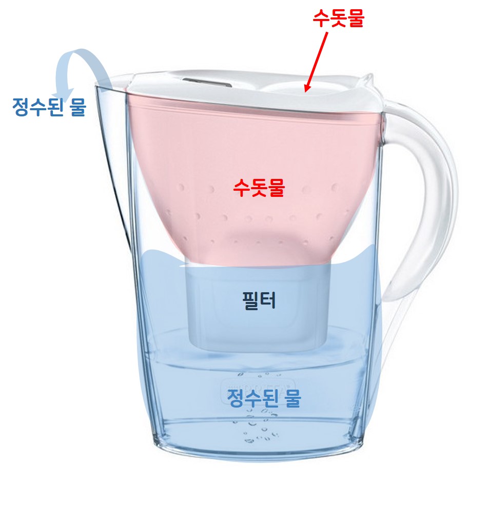 브리타 정수기의 최대 저수량은 그림에서 표시된 파란색 부분만큼입니다. 아무리 수돗물을 많이 넣어도 물이 용기의 아래쪽 반 정도 차 있으면 더이상 정수되지 않고 그냥 수돗물 칸에 수돗물이 머물러 있습니다. 그래서 이 상태에서 물을 따르면 수돗물이 나오지 않느냐고 많이들 걱정하시는데요. 수돗물 칸은 뚜껑으로 꼭 닫아놓으면 새지 않도록 차단되어 있어서 입구 부분으로는 정수물만 나오게 되어 있어요. 걱정하지 않으셔도 되요. 하지만, 수돗물이 꽉 차 있다면 그 무게 때문에 뚜껑 전체가 열리면서 왈칵 나오기도 해요.(브리타는 락앤락이 아니에요.) 그러니 정수된 물이 용기의 반 이상 차 있다 싶으면 더 이상 수돗물을 넣지 마세요. 어차피 수압 때문에 더 이상 정수 안되니까요. 정수물을 다 사용하면 다시 수돗물을 받으시고 기다리셨다가 다 정수되면 사용하세요.(엄청 귀찮음)