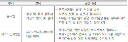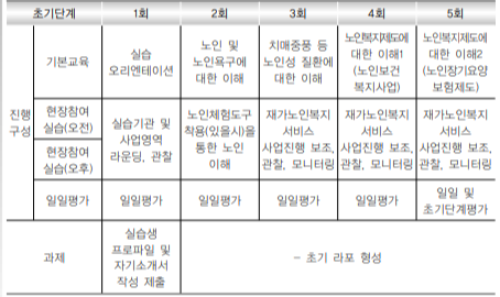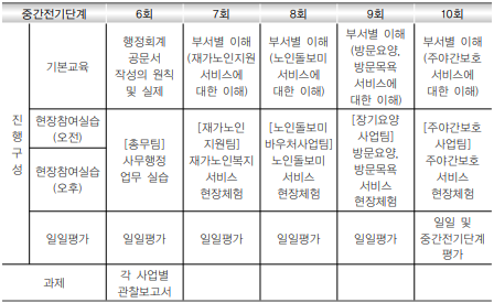 | 주요일정 및 내용 | (1) 중간전기단계 실습일정 구성 (안) 중간전기단계 6회 7회![]() (2) 진행내용별 세부사항 ① 기본 이론 교육 및 현장 참여 실습 ❐ 목적 : 재가노인복지사업의 다양한 현장에 대한 이해를 돕기 위해 부서별 실습을 통하여 전체 기관 사업에 대한 균형감 있는 이해 도모 ❐ 중간전기단계 내용 - 주요내용 ![]() ![]() - 주요방향 ・ 1일 1개팀의 다양한 재가노인복지분야 체험 ・ 사업별 담당직원(사회복지사 등)의 밀착교육 및 현장 배치지도 ※ 기관별 수행사업의 내용 및 종류에 따라 실습일정 상이하게 편성 |
