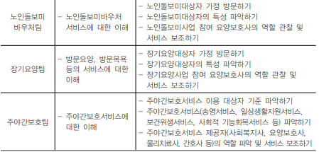 | 진행 포인트 | 재가노인복지시설의 다양한 역할 및 분야에 대한 관심을 환기시키고 외부자원의 연계나 프로그램의 기획과 발굴로써 서비스의 질을 높일 수 있는 부분에 대한 관심을 극대화 |