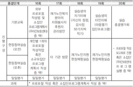| 단계 | 종결단계 (전문적 실천에 대한 모방실습, 평가단계) |