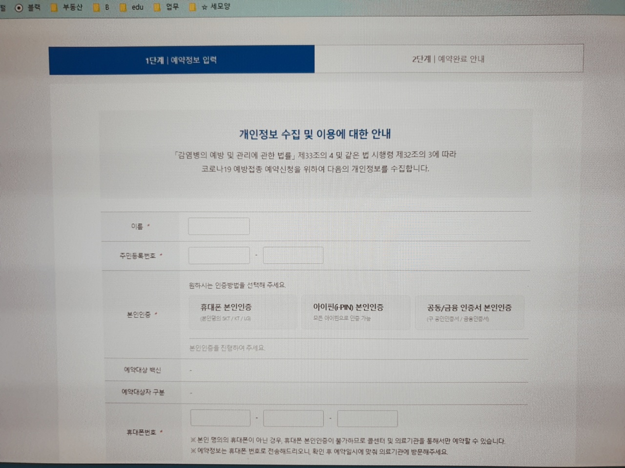 본인예약을 선택하고 입력사항을 모두 입력했어요.