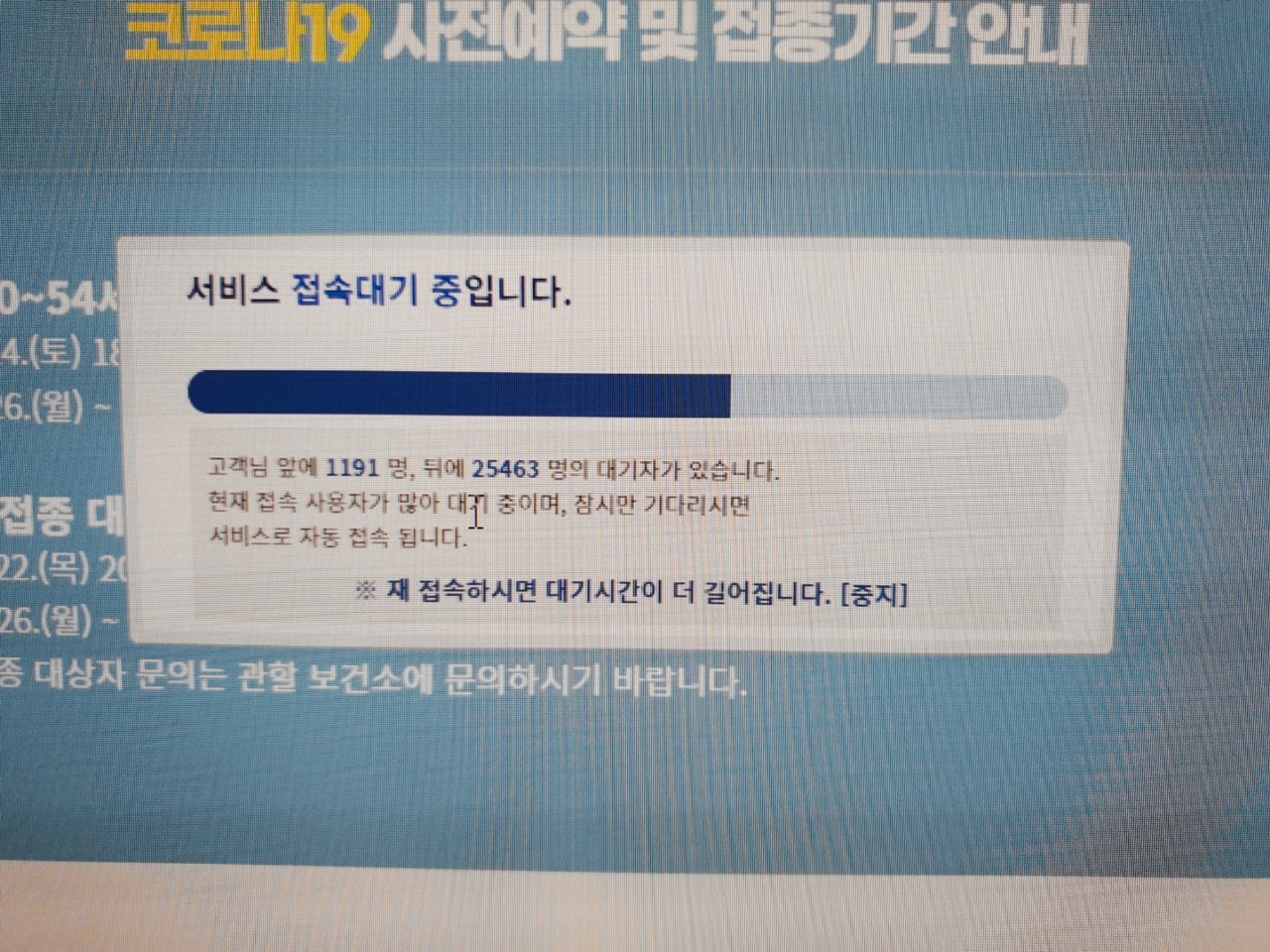 저는 PC 크롬 브라우저를 이용해 접속했었습니다. 계속 안눌려서 결국은 다시 재접속했더니 다시 대기자가 3만명이 되더군요. 이걸 한 두 차례 반복하고 매번 다시 초기화되어서 제 앞의 3만명의 대기자를 바라보는 저의 마음은... 아 코로나 백신 사전예약에 실패했다는 사람이 바로 나로구나 했어요....