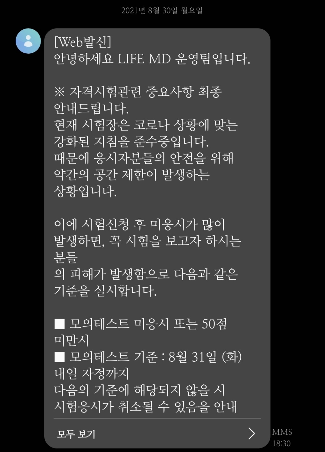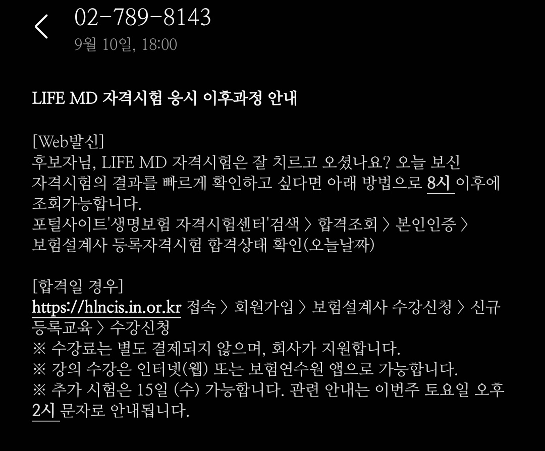 강의는 필수적으로 수강해야 하는 것은 아니니 필요하신 분만 수강하시면 됩니다. 어쨌든 모의고사 합격점수를 넘기고 일정시간이 지나면 시험장과 시험응시 시간을 알려주는 문자가 옵니다. 해당 날짜에 시험을 본 후 당일 저녁 8시 이후에 생명보험 자격시험센터 사이트에서 합격 사실을 확인하실 수 있습니다.