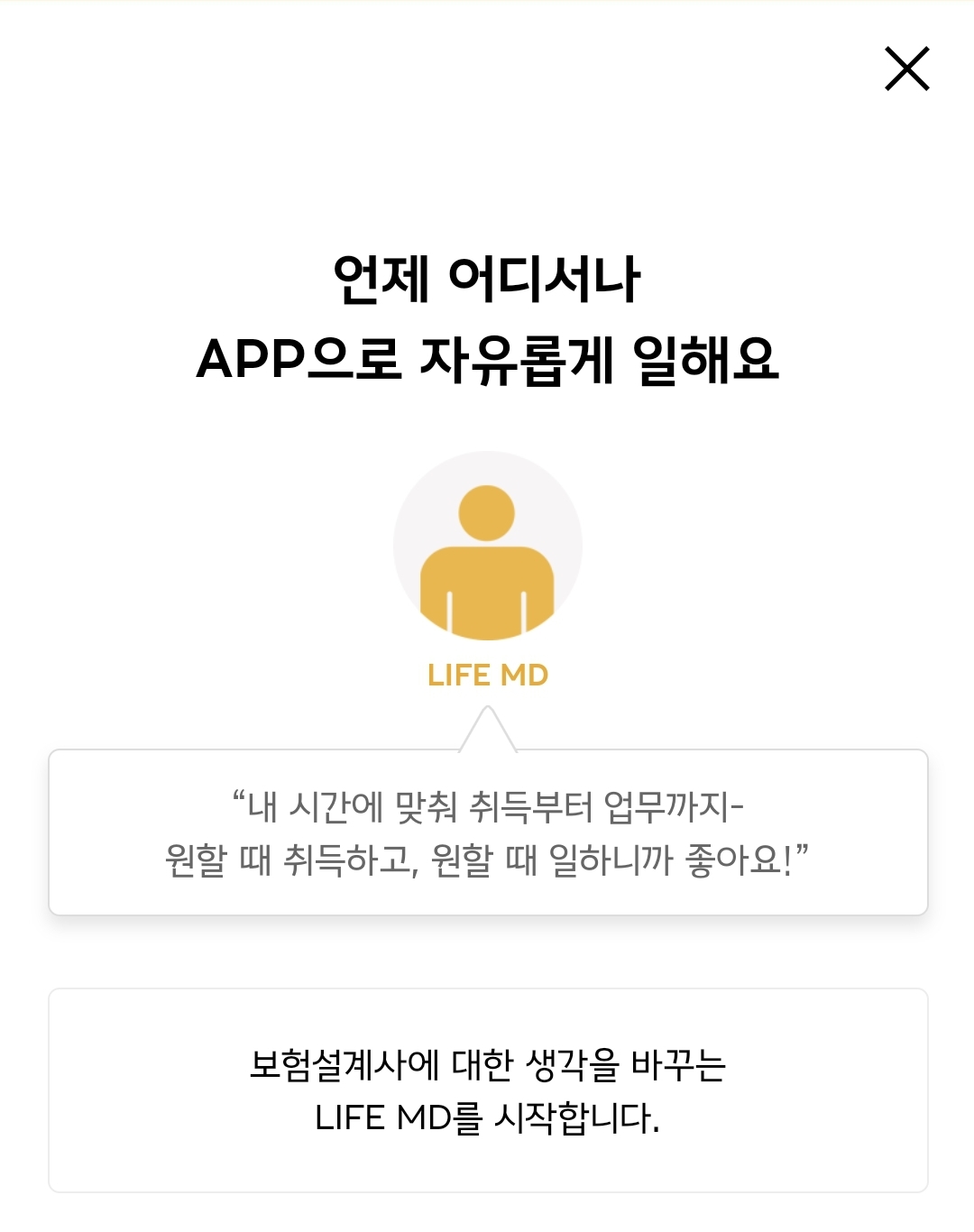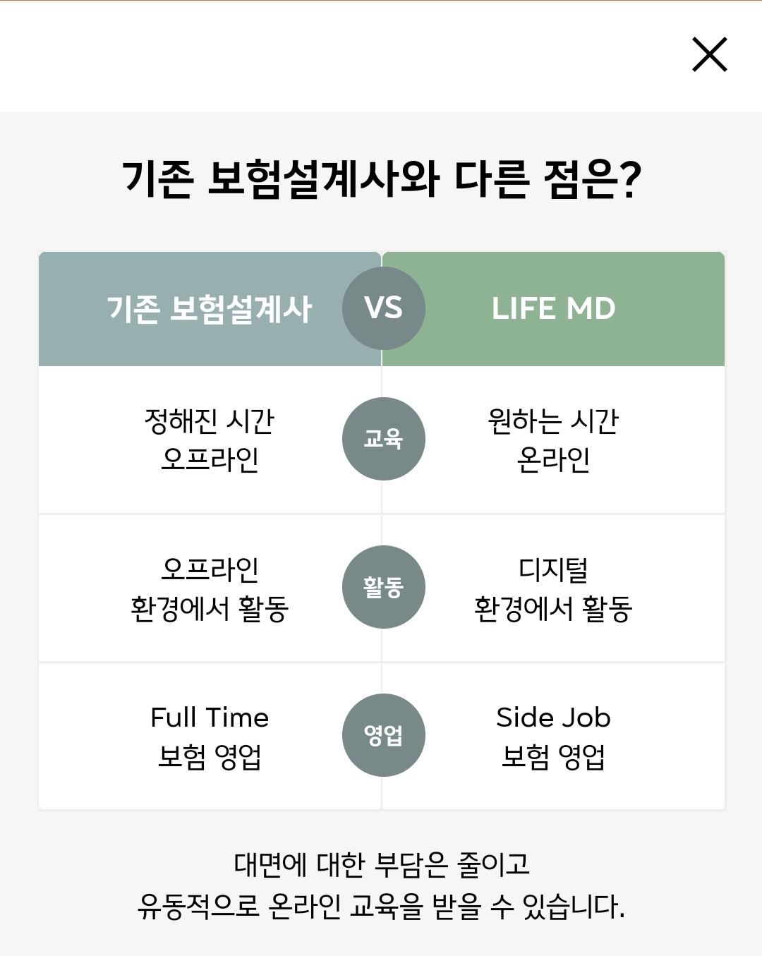 종전의 보험설계사와는 달리 자유로운 시간에 어플을 통해서 보험 설계 가입 등을 할 수 있고, 본업에 종사하는 사람도 부업으로 가능하다고 합니다. 본업이 아니라 부업이기 때문에 성과에 대한 압박이 없고, 압박할 상사도 없습니다. 그러니 무리해서 주변 지인들에게 보험 가입을 강권할 필요를 느끼지 못할 것 같기는 해요.