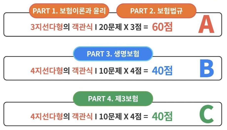 시험은 총 보험 이론과 윤리, 보험법규, 생명보험, 제3보험 과목으로 나뉩니다. 총 40문항입니다만, 점수 산출 방법이 독특합니다. 아래 그림처럼 A+B(공통+생명보험)의 점수가 60점이 넘어야 하고, A+C(공통+제3보험)의 점수가 60점이 넘어야 합격입니다. 만약 떨어진다면 다시 재시험을 볼 수 있다고 하니 너무 부담가지지 않으셔도 될 것 같아요.
