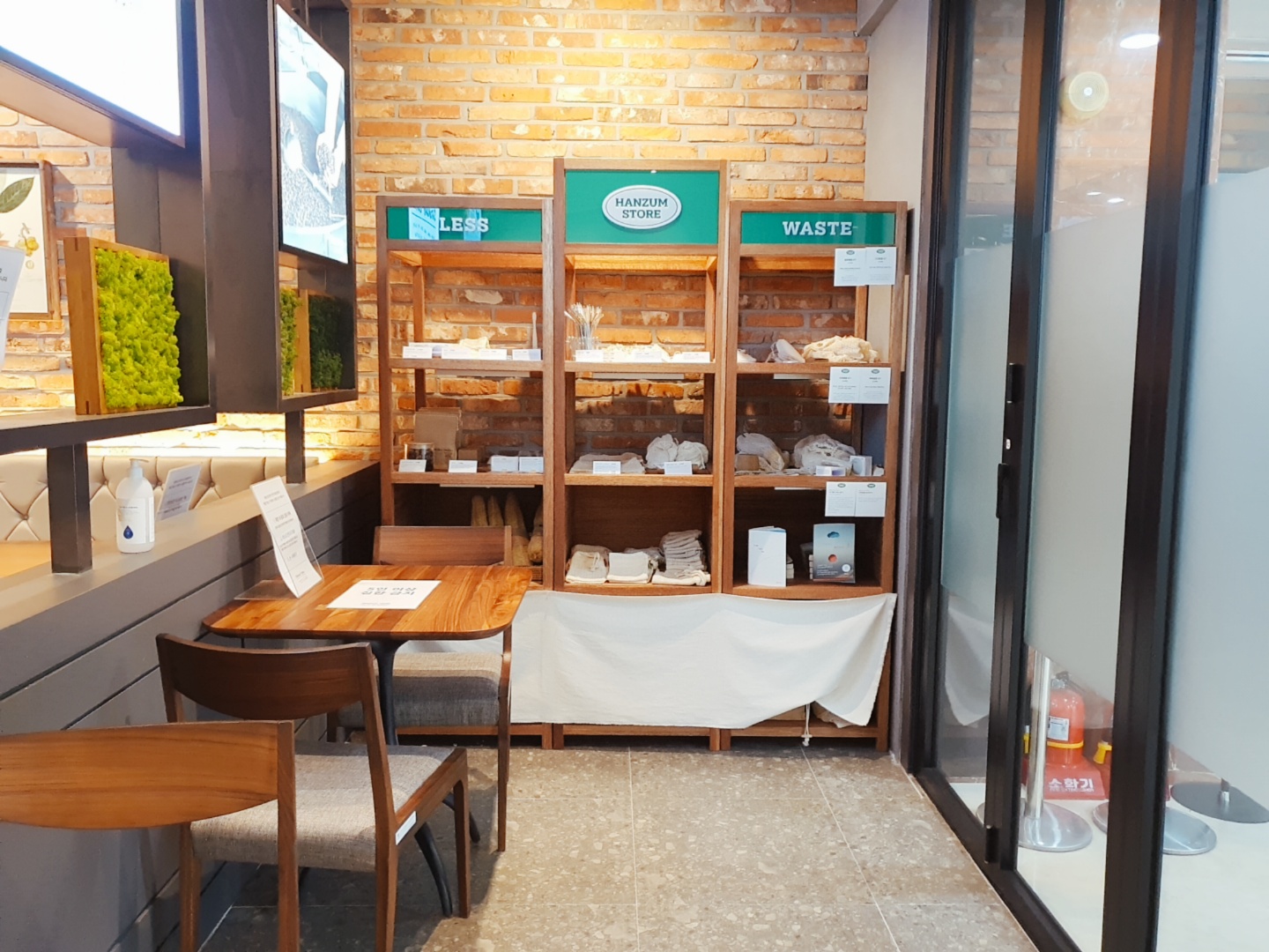 카페 내부에서는 친환경 상품이 진열되어 있었어요. 친환경 제품에 관심이 많으신 분들을 방문해 보셔도 좋을 것 같습니다.