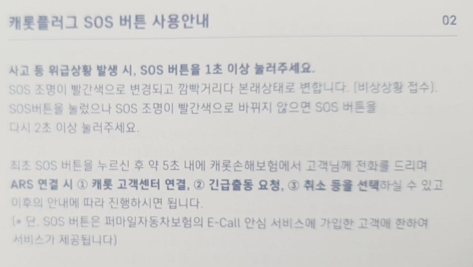 사고발생 혹은 위급상황 시 저 캐롯 플러그의 SOS 버튼을 1초 이상 누르는 것 만으로도 사고접수가 되어 직접 전화를 준다고 합니다.누르면 캐롯 퍼마일에서 알아서 전화를 준다네요. 와우~. 기술이 좋긴 좋네요.