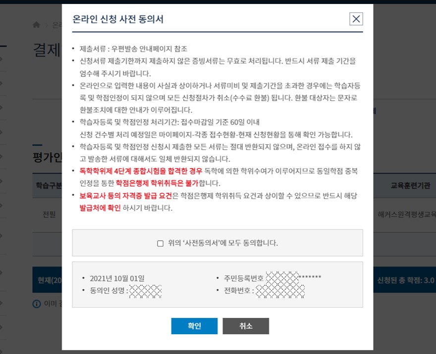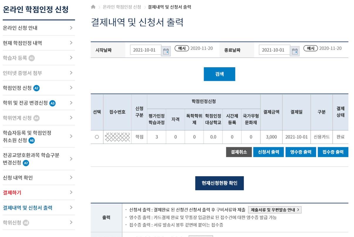 해당하는 달에는 학습자등록도 동시에 진행됩니다. 해당하는 달 초일부터 말일까지 신청 가능해요. 저는 3학점짜리 한 과목만 이수했고, 이 과목을 학점인정 신청을 했는데요. 1과목 3학점이니 총 3천원의 수수료가 발생했어요.