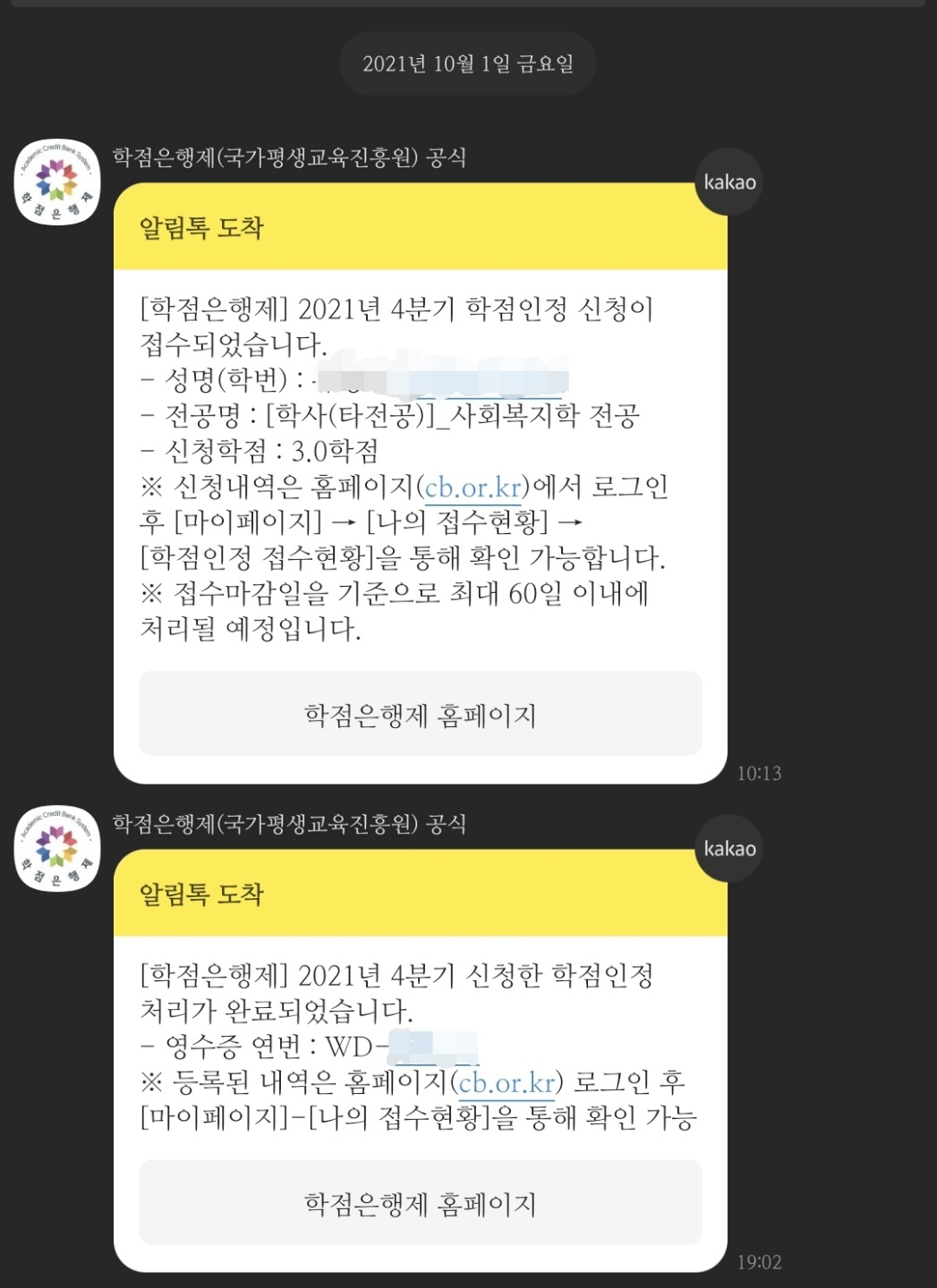 학점인정 신청 처리에 걸리는 시간은 보통 3일 이상에서 3개월 이내라는 말이 많은데요. 저는 별다른 증빙서류가 필요없는 과목이라서인지 7~8시간만에 학점인정되었다는 통보를 카카오톡으로 받았습니다.