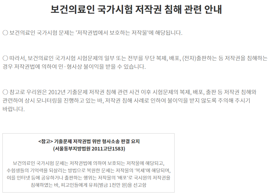 요양보호사 시험이 많이 어렵진 않을까 걱정하시는데요. 10명중 8명 이상이 합격하는 시험이니 너무 걱정하지 않으셔도 됩니다. 하지만 쉬운 시험이라고 해서 손 놓고 공부를 안하면 떨어지기 십상이에요. 학원에서 가르쳐주는대로만 따라가면 충분히 합격할 수 있는 시험입니다. 요양보호사 문제는 문제은행식이에요. 그래서 시험을 주관하는 국시원 측에서는 기출문제를 공개하지를 않고 있습니다. 기출문제를 공개하면 저작권 위반으로 고소하겠다고 공지도 해놓은 상태고요.