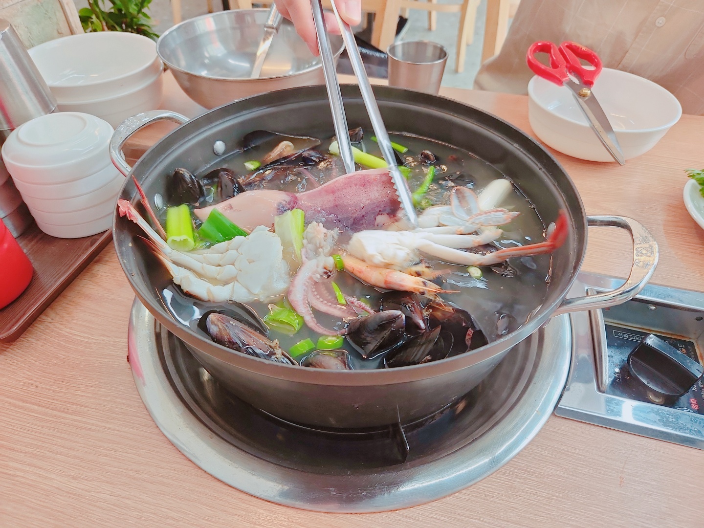 처음에 해물칼국수를 주문하면 솥 안에 육수와 해물만 넣어서 줍니다. 오징어는 오래 익히면 질겨지니까 살짝 익으면 바로 건져서 고추장에 찍어먹어 줍니다. 그리고 그다음에 홍합과 꽃게가 익으면 차례로 건져내어 흡입합니다. 해물을 거의 먹어치웠다면 이제 직원분에게 면을 달라고 하시면 됩니다. 저는 밀가루 묻은 칼국수 반죽면이 나올 줄 알았는데, 의외로 탱탱하게 익은 우동사리면이 나오더라구요?? 어쨌든 익힐 시간 벌었으니 좋죠. 진하게 우러나온 해물육수에 면을 투하하세요. 중불에 2~3분만 끓여도 면에 간이 배더라고요. 국수까지 먹으니 한끼가 너무 든든하더라구요. 만족스러운 외식이었어요.