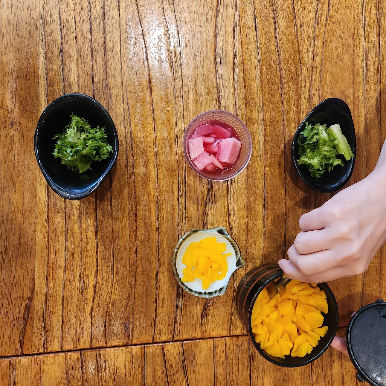 샐러드와 무초절임이 곁들여 나와요. 우동만 먹으면 좀 느끼한데, 샐러드와 함께 먹으니 괜찮은 듯합니다.