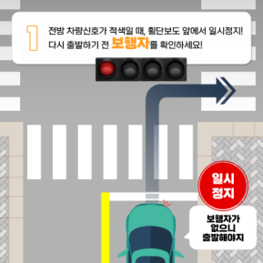 결론은, 교차로 직전의 횡단보도에서 차량신호등이 적색이더라도 일시정지 후 보행자가 없는 것을 확인하고 진행하면 됩니다.