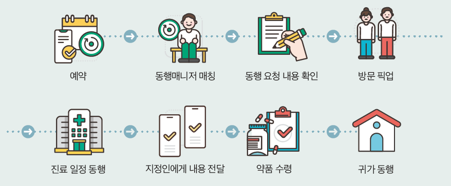 병원동행매니저는 혼자 병원을 가기 힘든 이들을 위해 진료 예약부터 동행, 진료 내용 전달, 약국 동행 등까지 진료에 관련된 일련의 행위를 도와 주는 일을 합니다. 병원동행매니저는 환자가 집을 나와 병원에서 진료를 한 이후 귀가할 때까지 환자와 함께 하여야 합니다.