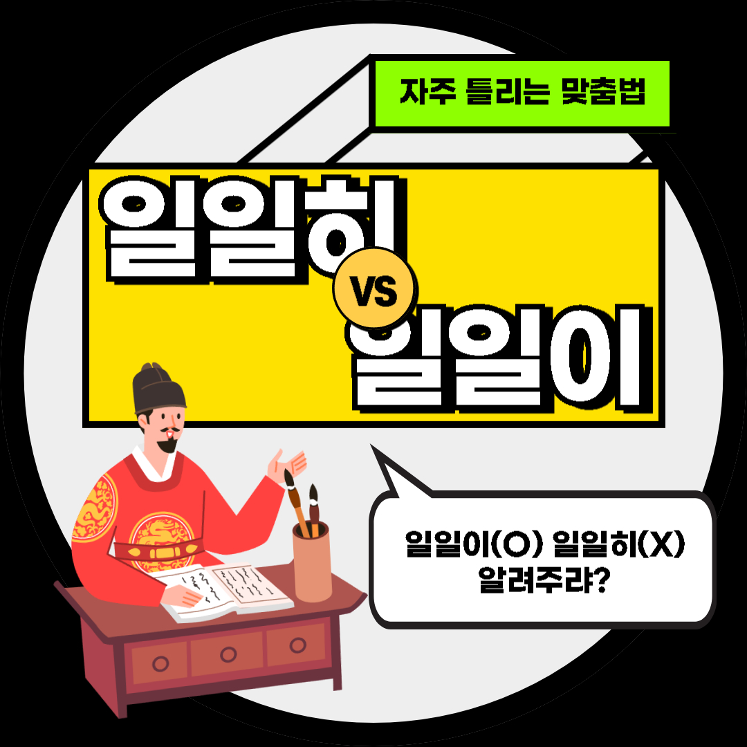 해설 : 어떤 때에는 '-히'로 적고 어떤 때에는 '-이'로 하니 많이 헷갈리시죠? 한글맞춤법 제51항에는 '부사의 끝음절이 분명히 '이'로만 나는 것은 '-이'로 적고, '히'로만 나거나 '이나 '히'로 나는 것은 '히'로 적는다'고 되어 있습니다. 많은 사람들이 이미 '일일히'로 발음하고 있는 것 같고, 규정이 이러하니 '일일히'가 맞는 것 같지만, 어문규정이라는 것이 세상의 속도를 따라잡기 힘든가 봅니다. 아직은 '일일이'가 맞다고 보고 있습니다 또한 겹쳐 쓰인 명사 뒤에서는 '이'로 적는다고 되어 있어요. '겹겹이, 곳곳이, 다달이, 샅샅이, 알알이, 줄줄이'처럼요.