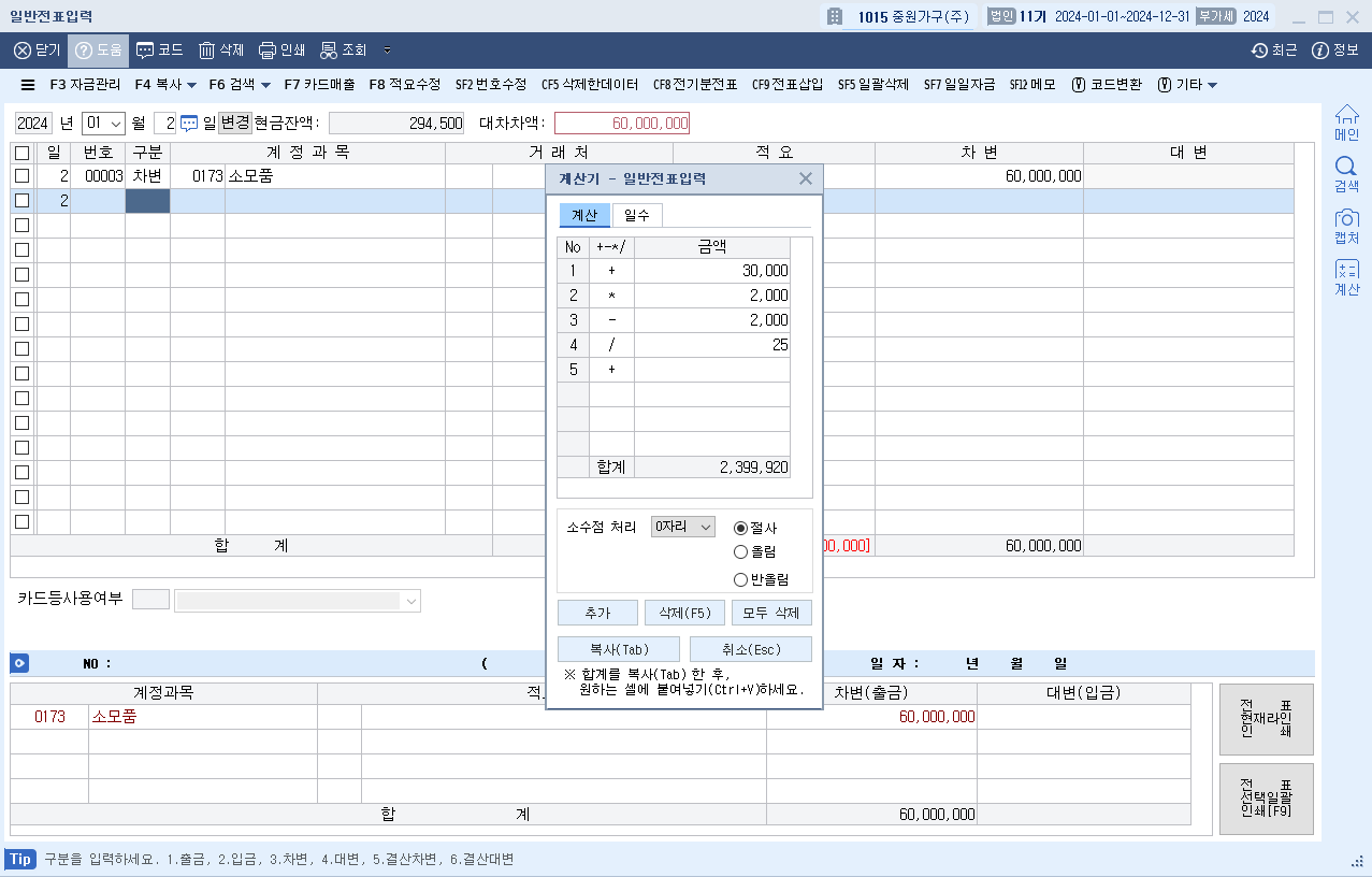 케이랩 프로그램의 <일반전표입력>, <매입매출전표입력>에만 있는 계산기 기능 알고 계셨나요? 제가 시험장에 계산기를 놓고가서 유용하게썼는데요. 금액을 입력하고 엔터키를 누르면 다음행으로 넘어가지는데요. 그 다음에 수식을 입력하고 숫자를 입력하면 결과값이 나옵니다. 그러면 그 값을 복사(TAP키)해서 붙여넣기(Ctrl+V)할 수 있어요! 어쩌면 계산기보다 간편할 수도 있구요.