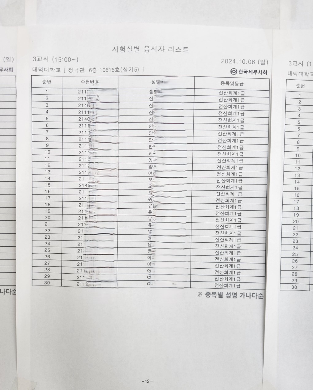 어쨌든 시험장 입구에서 잘 찾아보니 1층 현관 근처에 응시자 리스트가 붙어 있었습니다. 이런 A4 용지가 한 7~8장이 한꺼번에 붙어 있는데 여기서 내 이름 찾는 것도 일입니다. 시력 나쁘신 분들은 한참 보시더라고요.