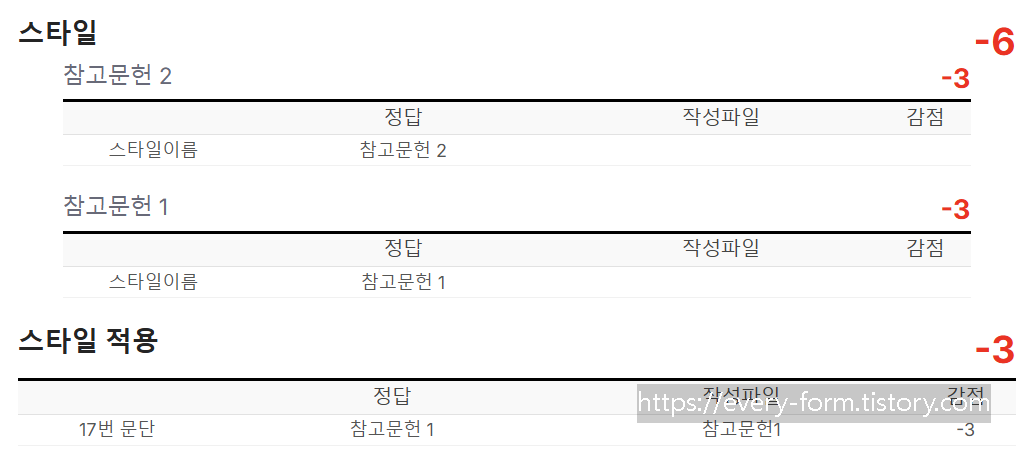 단어 간 띄어쓰기 두번 되어 있어도 감점, 글씨 색깔 잘못 설정해도 감점, 스타일 이름 잘못되어도 감점, 표의 줄간격이 일치하지 않아도 감점입니다.