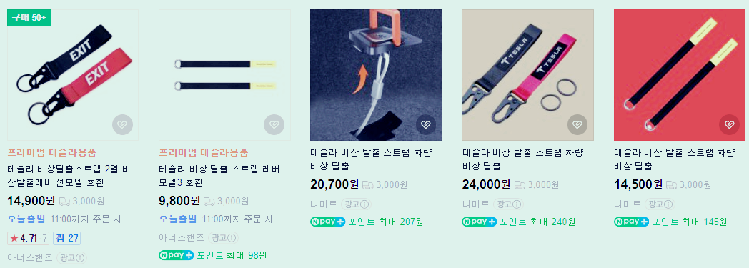 네이버 쇼핑몰에서 "테슬라 탈출 스트랩"으로 검색하면 꽤 많은 제품이 나옵니다.(아래 참조)