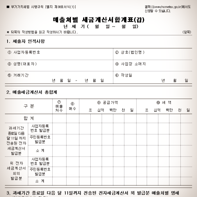 "[위 전자세금계산서 외의 발급분]"에 대한 각각의 매출처별로 순서대로 적습니다. <매출처별 세금계산서합계표(갑)>서식을 초과하는 경우 <매출처별 세금계산서합계표(을)>서식에 계속 이어서 적습니다.