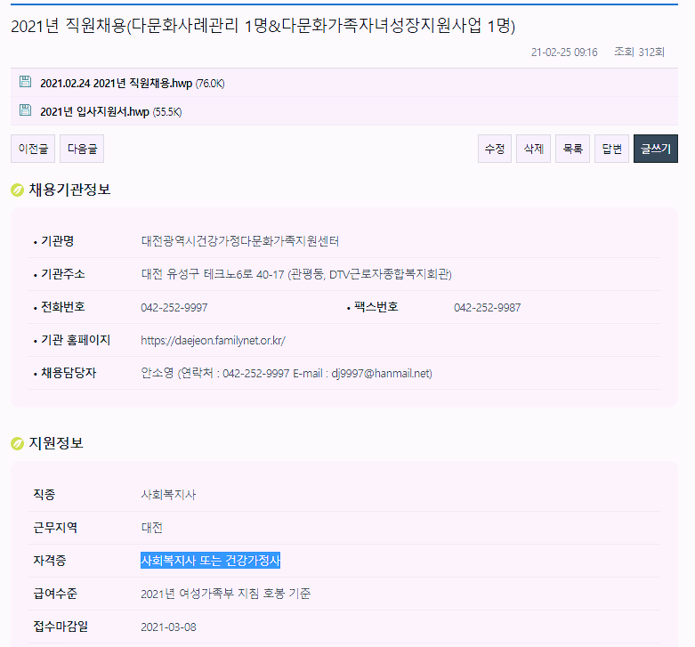 건강가정사의 근간이 되는 법률은 건강가정기본법으로, 이 법률은 건강한 가정을 위해 국가와 지자체가 해야할 의무를 정하고 있는 법이라고 보시면 됩니다. 이 법률에 의해 각 지자체는 건강가정사업을 위한 건강가정지원센터 또는 다문화가족지원센터 등을 설립하여 운영하고 있으며, 이 곳에서 건강가정사를 채용합니다. 아래 그림에서처럼 '건강가정사 채용 공고'로 검색하시면 채용 공고를 쉽게 찾아보실 수 있습니다.