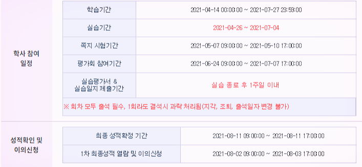 사회복지현장실습 과목은 실습 지역 제한이 있는 경우도 있고, 기관 실습 총 시간이 120시간인 종전법과 160시간이 현행법에 따라 달리 개설되는 경우도 있습니다. 따라서 이 모든 것을 감안하여 사회복지현장실습 과목을 찾고 수강신청을 해야 합니다. 문제는 대부분의 교육 기관에서 연간 교과목 개설 계획이 없어서 여러곳에 전화로 문의를 드려야 한다는 점입니다. 또 수강신청 전에 학습계획서를 봐야 실습 가능 기간을 알 수 있을텐데, 그마저도 회원가입을 해야 볼 수 있는 곳이 많습니다. 이처럼 어려움이 많더라도 모든 수단과 방법을 동원하여 사회복지현장실습을 신청해야 합니다. 실습기관을 구했더라도, 실습 가능 기간에 맞출 수 있는 사회복지현장실습을 수강 신청하지 못한다면 결국 모든 것은 허사가 되기 때문입니다. 아래 그림에서 보듯이 사회복지현장실습 수업 일정을 보면 실습기간이 표시되어 있습니다. 이 기간 안에 기관 실습을 하지 않으면 안됩니다.