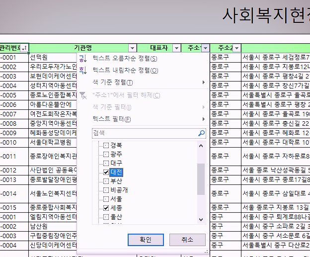2. 엑셀 파일의 주소에서 자신이 이동가능한 지역구의 체크박스를 선택합니다.(아래 그림 참고)
